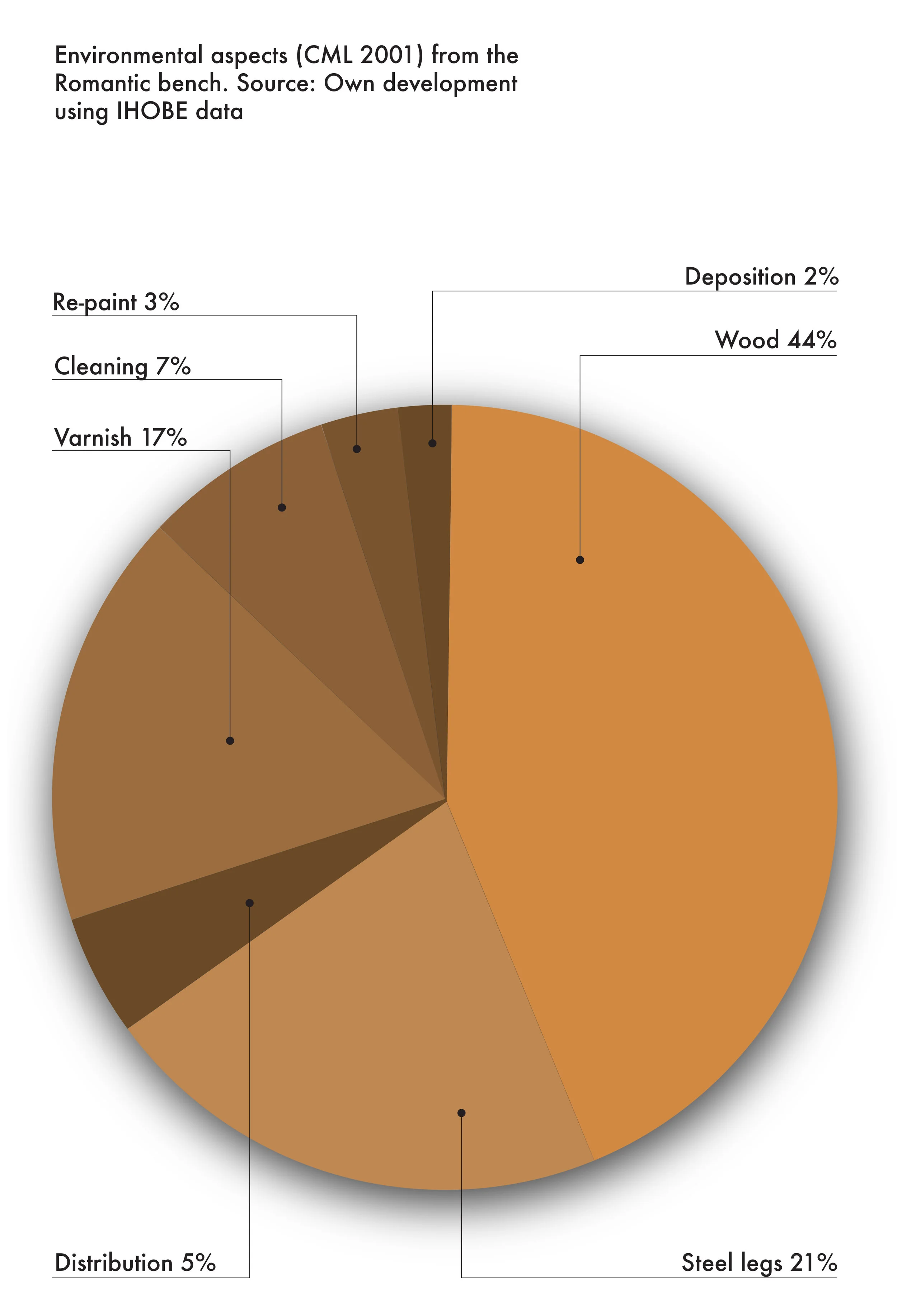 Regarding the information from IHOBE, the environmental impact of the Romantic bench -the best seller in Spain until the begining of this century- is induced mostly by the use of wood (44%) and the maintenance during its life span (27%)